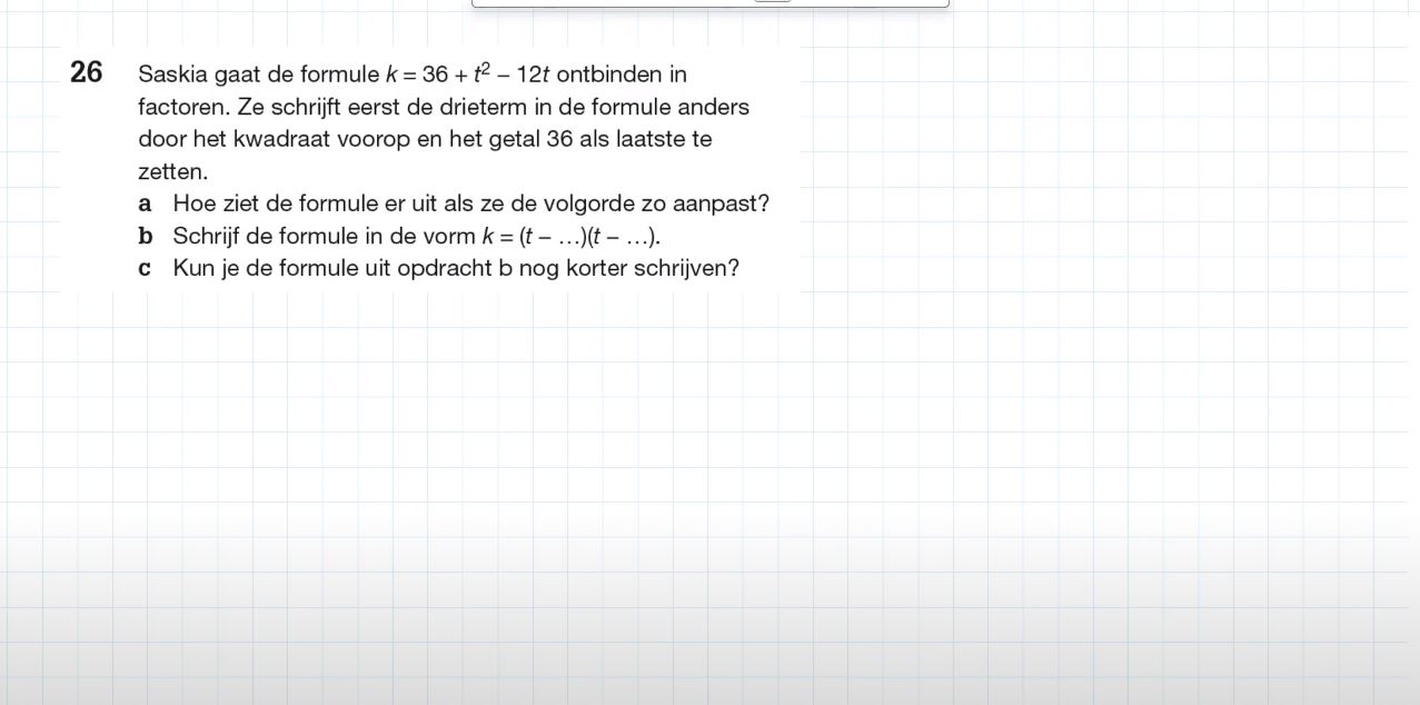 Hierboven vind je de video-uitleg van §11.3 Ontbinden van drietermen opgave 20 en links in het gele blokje (indien aanwezig), kun je de theorie bekijken in video.